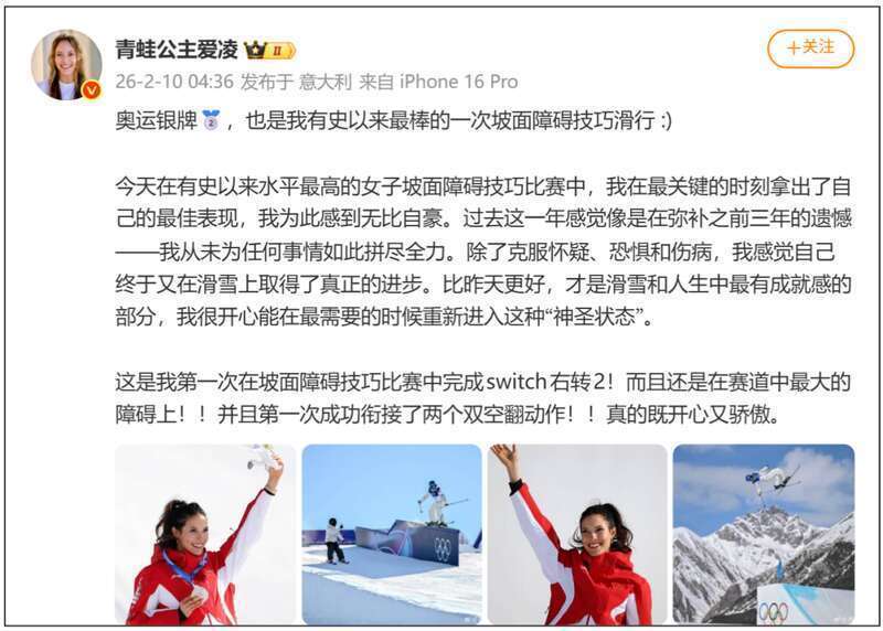 今天凌晨,谷爱凌在社交平台发文称:“奥运银牌,也是我有史以来最棒的一次坡面障碍技巧滑行。”“我在最关键的时刻拿出了自己的最佳表现,我为此感到无比自豪。”